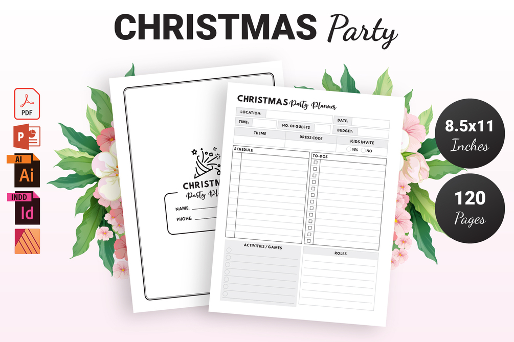 Download “Christmas Party Planner” instantly with PDF Ready to upload on KDP with PowerPoint, Affinity Publisher, Illustrator, InDesign source files for customization.