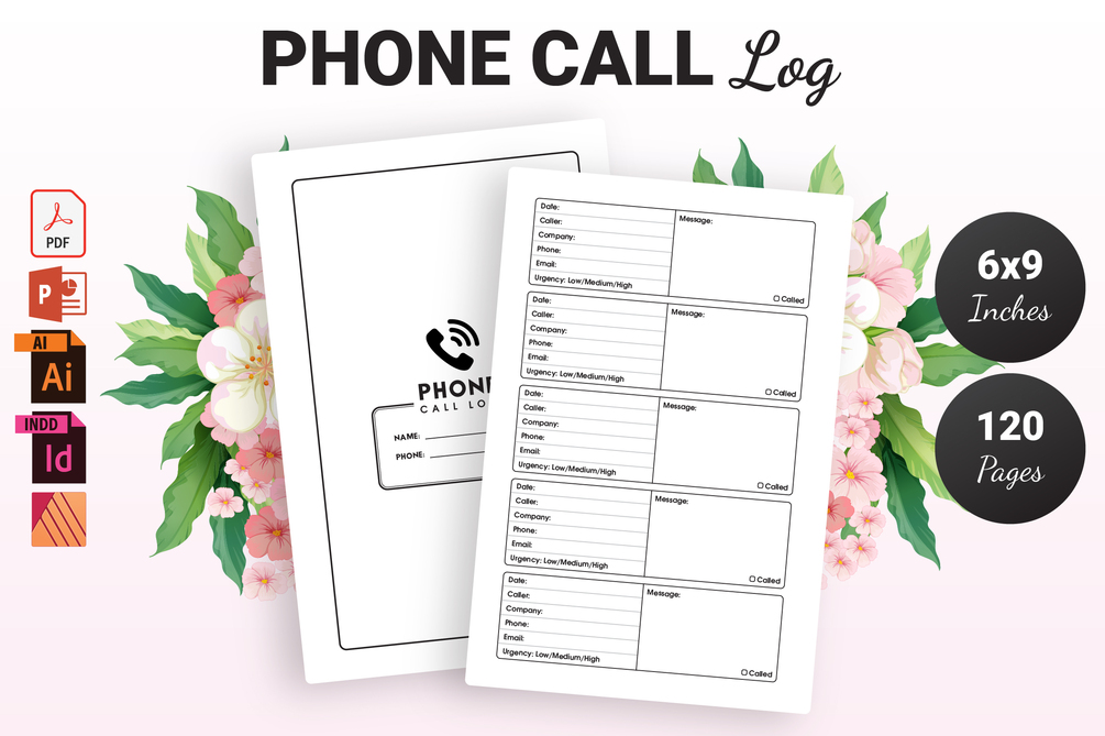 Download “Phone Call Log Book” instantly with PDF Ready to upload on KDP with PowerPoint, Affinity Publisher, Illustrator, InDesign source files for customization.